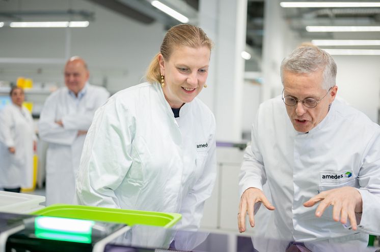 Dr. med. Arndt Gröning und Carina Hermann im Gespräch während der Führung durch das neue Labor im NewHome Göttingen