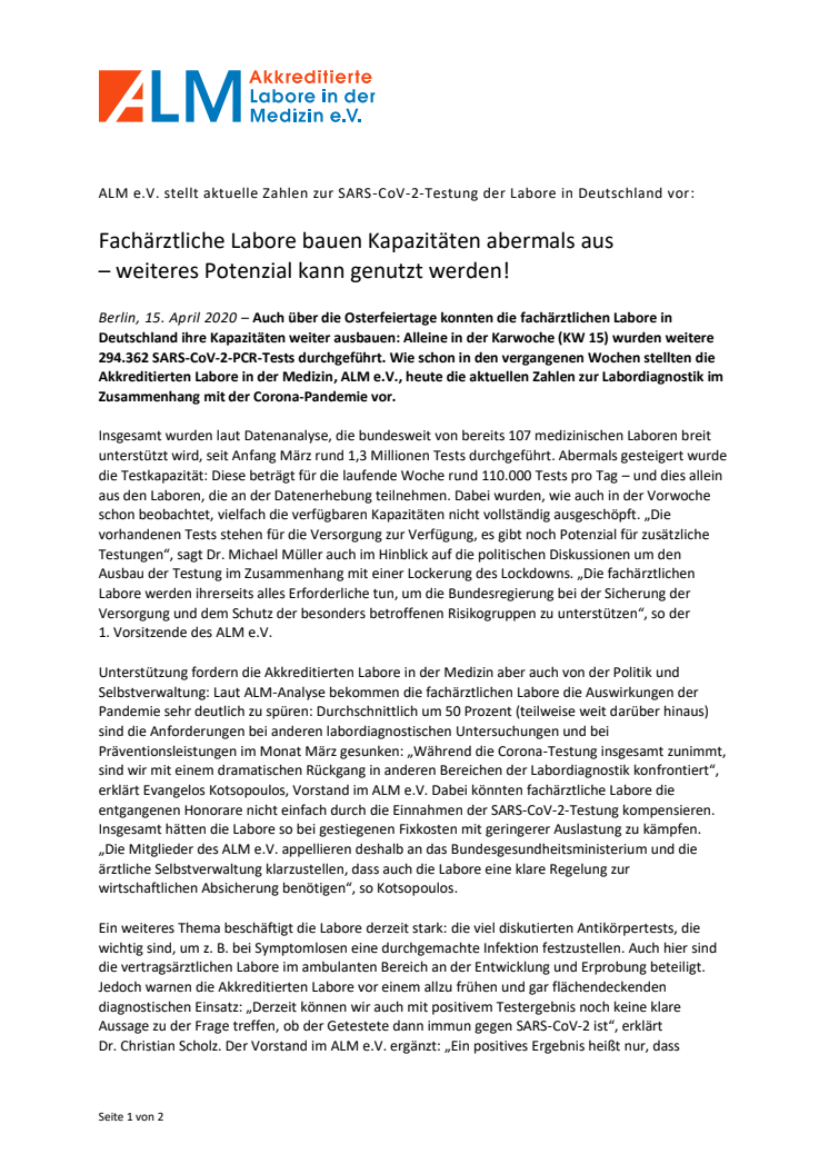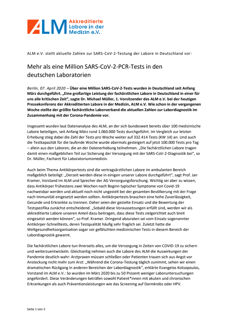 • Pressemitteilung ALM e.V. - Mehr als eine Million SARS-CoV-2-PCR-Tests in den deutschen Laboratorien