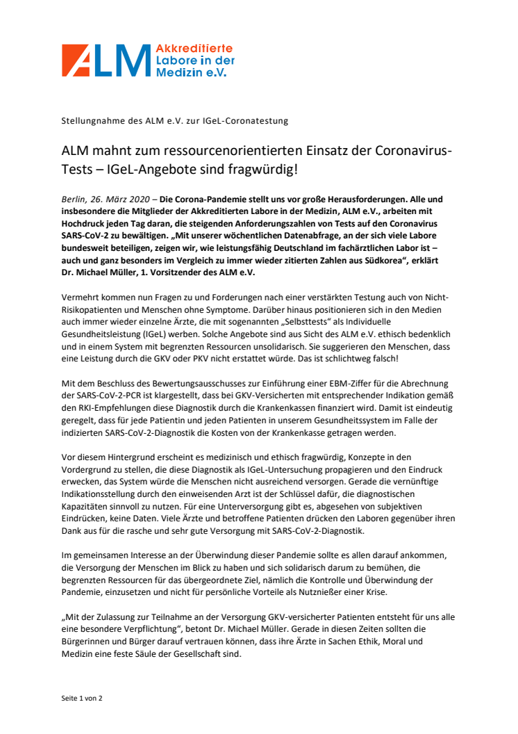 • Pressemitteilung ALM e.V.: Stellungnahme zur IGeL-Coronatestung