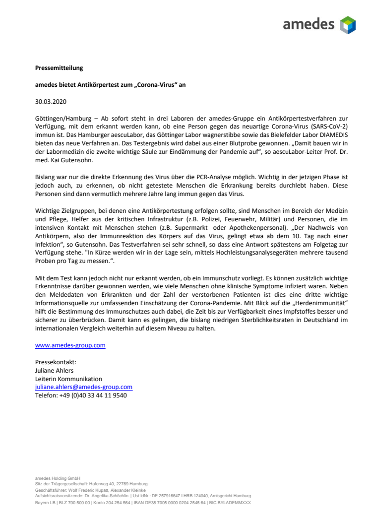 • amedes bietet Antikörpertest zum „Corona-Virus“ an