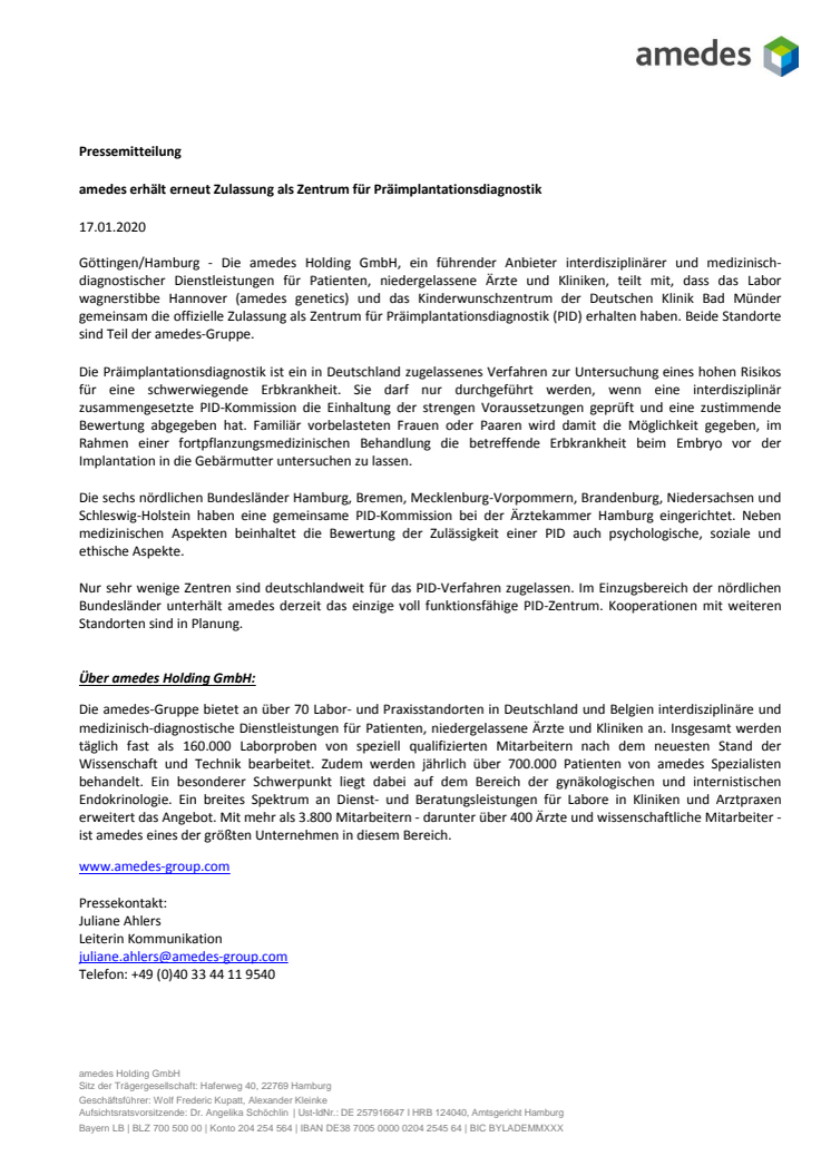 Die amedes Holding GmbH, ein führender Anbieter interdisziplinärer und medizinisch-diagnostischer Dienstleistungen für Patienten, niedergelassene Ärzte und Kliniken, teilt mit, dass das Labor wagnerstibbe Hannover (amedes genetics) und das Kinderwunschzentrum der Deutschen Klinik Bad Münder gemeinsam die offizielle Zulassung als Zentrum für Präimplantationsdiagnostik (PID) erhalten haben. Beide Standorte sind Teil der amedes-Gruppe.