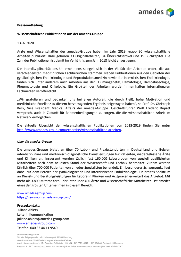 Ärzte und Wissenschaftler der amedes-Gruppe haben im Jahr 2019 knapp 90 wissenschaftliche Arbeiten publiziert. Dazu gehören 33 Originalarbeiten, 34 Übersichtsartikel und 19 Buchkapitel. Die Zahl der Publikationen ist damit im Verhältnis zum Jahr 2018 leicht angestiegen.